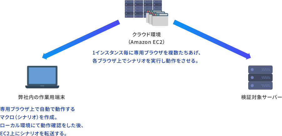 弊社では 、専用ブラウザ と クラウド環境( Amazon EC2 ) を使用し負荷テストを実現させています。 負荷テスト時には、各プラットフォーマー様のサーバーはサービスに影響が出るため使用できません。そのため、本検証サービスではプラットフォームを経由しない方法にて負荷テストを実現させています。事前に決められたアプリケーション内での一連の動作を、専用ブラウザ上で自動化したシナリオを用います。